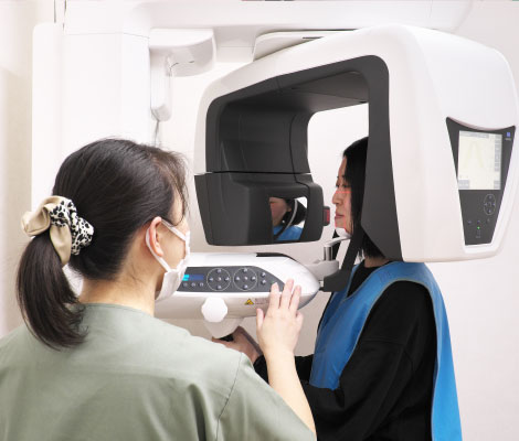 撮影装置が頭の周りをぐるっと回転して撮影し、上下左右の歯全体と周囲の骨も比較的広範囲に写し出します。