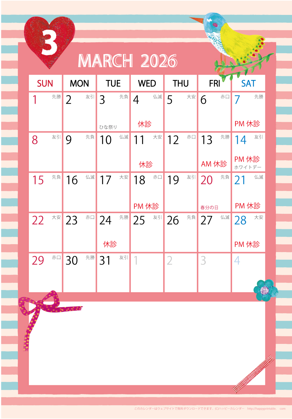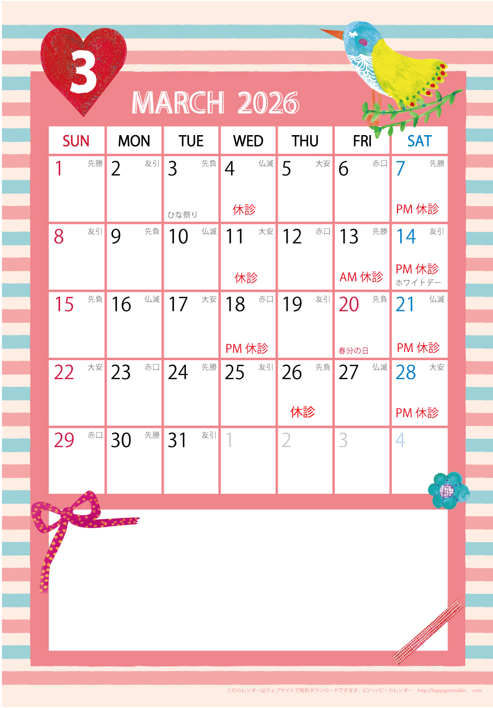 ホーム > お知らせ:診療日のお知らせ > 2026年3月診療日のお知らせ